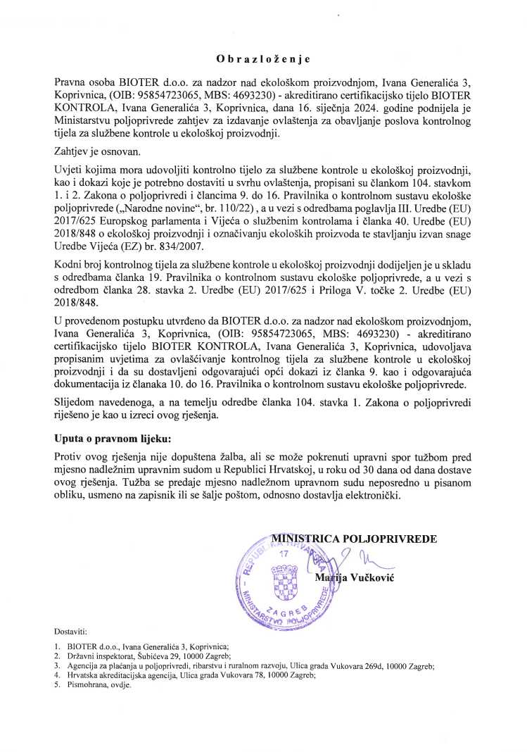 Prema zahtjevu pravne osobe BIOTER d.o.o. za nadzor nad ekološkom proizvodnjom, a na temelju odredbe članka 104. stavka 1. Zakona o poljoprivredi („Narodne novine“ br. 118/18,42/20, 127/20, 52/21, 152/22), 20. veljače 2024. godine Ministarstvo poljoprivrede donosi Rješenje kojim se ovlašćuje BIOTER d.o.o. za obavljanje poslova kontrolnog tijela za službene kontrole u ekološkoj proizvodnji, u opsegu utvrđenom Potvrdom o akreditaciji i Prilogom potvrde o akreditaciji br. 3620, KLASA: 383-02/23-70/005, URBROJ: 569-04/4-24-16 od 20. veljače 2024. godine, a izdanim od Hrvatske akreditacijske agencije.